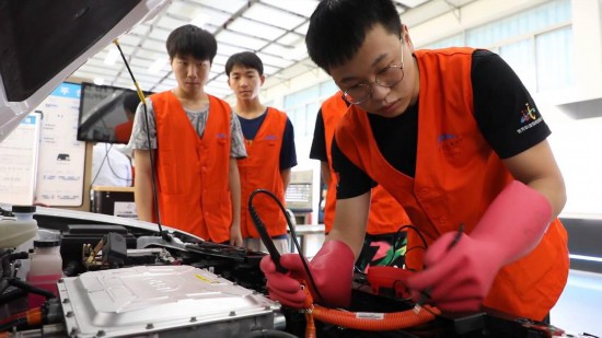 在深圳職業(yè)技術(shù)學(xué)院的汽車與交通學(xué)院實(shí)訓(xùn)室,大三學(xué)生宋明亮在與同學(xué)們學(xué)習(xí)汽車檢測(cè)與維修原理。在這所高職院校,從5G無(wú)人駕駛汽車,到地鐵駕駛艙、智能機(jī)器人,甚至企業(yè)沒(méi)有面市的最新科研成果,都成為該校的教學(xué)樣本。