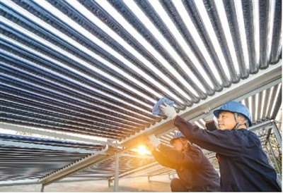 河北省邢臺(tái)市臨城縣結(jié)合山區(qū)日照資源豐富的優(yōu)勢(shì),因地制宜推廣太陽(yáng)能、光伏等清潔取暖,打造綠色低碳的清潔供暖體系。圖為11月14日,專(zhuān)業(yè)人員在臨城縣祁村檢查維護(hù)太陽(yáng)能取暖設(shè)備。 柴更利攝(人民視覺(jué))
