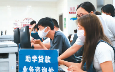 今年8月9日,在貴州省黔西市人民政府政務(wù)服務(wù)中心,志愿者在為大學(xué)生辦理信用助學(xué)貸款。 新華社發(fā)