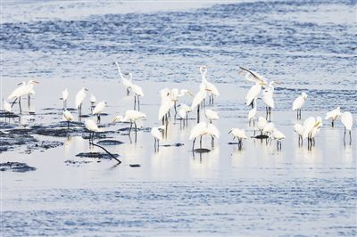 10月13日,在海南東寨港國家級(jí)自然保護(hù)區(qū),一群鷺鳥在灘涂上覓食。新華社記者 張麗蕓攝