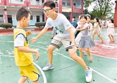 2022年暑期,武漢大學(xué)的大學(xué)生志愿者來到江西省南昌市灣里管理局羅亭鎮(zhèn)義坪小學(xué)參加“童心港灣”關(guān)愛留守兒童活動。圖為志愿者和留守兒童一起做游戲。 新華社發(fā)