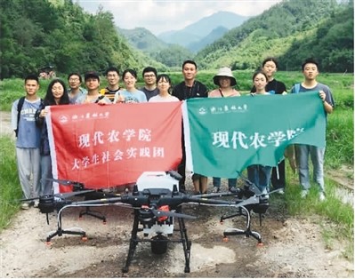 2021年7月,浙江農(nóng)林大學(xué)“植物醫(yī)生”大學(xué)生暑期社會實踐團(tuán)到杭州市一個水稻基地,提供植保無人機(jī)噴藥服務(wù)。 浙江農(nóng)林大學(xué)供圖