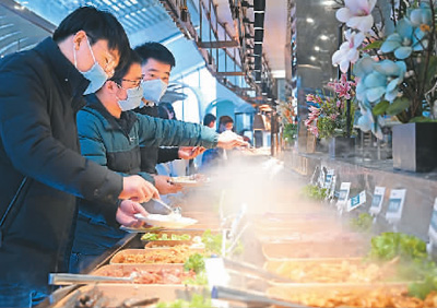 近期,天津線下餐飲、旅游、購物等消費(fèi)業(yè)態(tài)回暖跡象顯著。圖為顧客在天津恒隆廣場一家自助餐廳內(nèi)取餐。 新華社記者 趙子碩攝